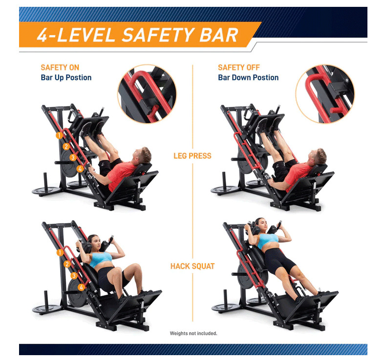 Hack Squat / Prensa de Piernas: Versátil para realizar tanto hack squats como ejercicios de prensa de piernas.